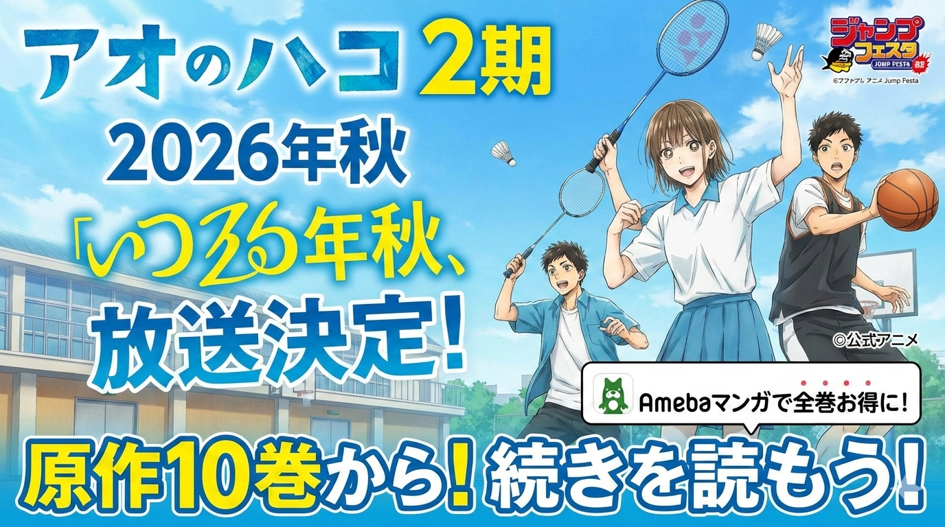『アオのハコ』第2期について、2026年2月18日時点で判明している情報をまとめると次のとおりです。放送時期は2026年秋(10月期)にTBS系28局にて放送が決定しています。2025年12月のジャンプフェスタ2026にてSeason2の正式発表がなされ、イラストレーター・かとうれい氏による描き下ろし「ブルービジュアル」第1弾・第2弾も公開されました。