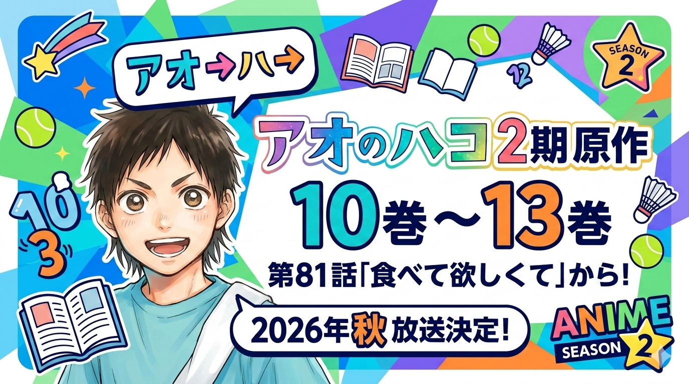 『アオのハコ』アニメ2期は2026年秋に放送決定。原作10巻から13巻前後までが描かれると予想されています。1期で雛への答えを出した大喜が、千夏との関係をどう深めていくのか、そして新キャラクター・後藤夢佳の登場で千夏の過去がどう掘り下げられるのか――2期は1期以上にドラマチックな展開が待っています。