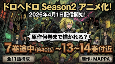 結論から伝える。ドロヘドロ Season2(2026年4月1日配信開始)は、原作漫画の第7巻途中(第40話)からスタートし、原作13〜14巻付近まで描かれる見込みだ。全11話構成で制作はMAPPA。Season1で描かれなかった魔法使いの世界・魔の深部が本格的に動き出す。