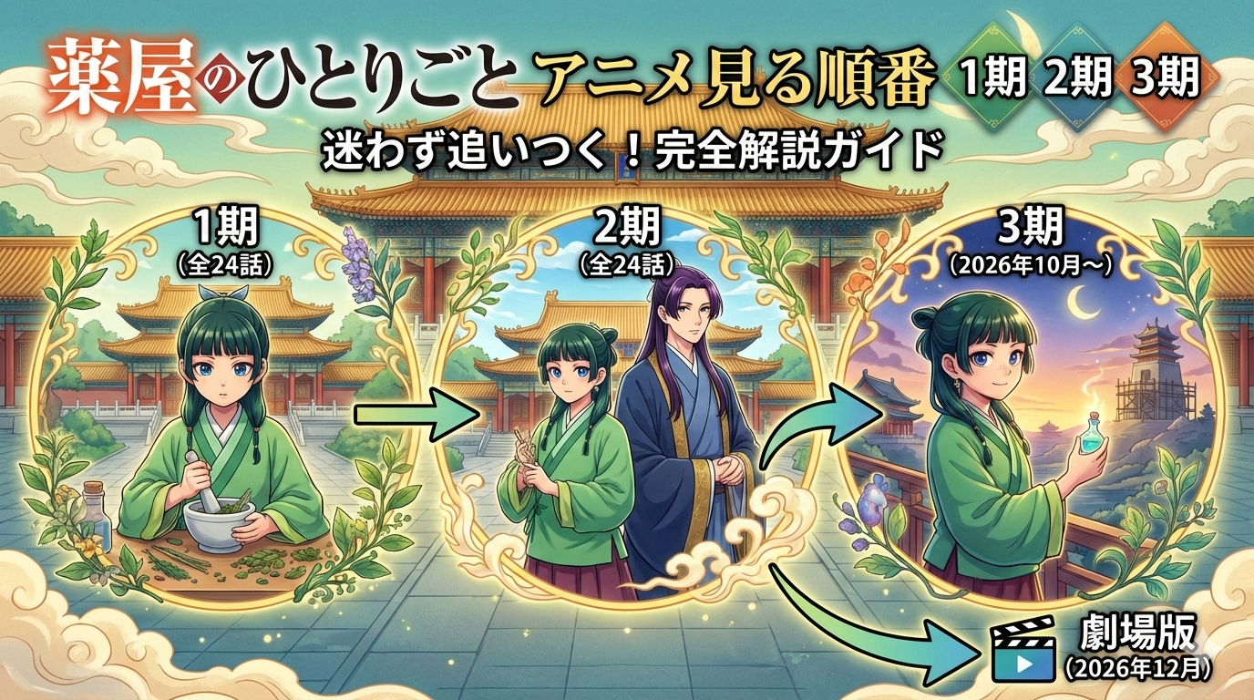 『薬屋のひとりごと』のアニメを見る順番は、1期(全24話)→ 2期(全24話)→ 3期(2026年10月~)の放送順でそのまま視聴すればOKです。時系列の入れ替えや外伝的な作品がないため、迷うことはありません。さらに2026年12月には劇場版の公開も決定しています。この記事では各期の内容・原作対応巻・3期までに追いつく方法を徹底解説します。