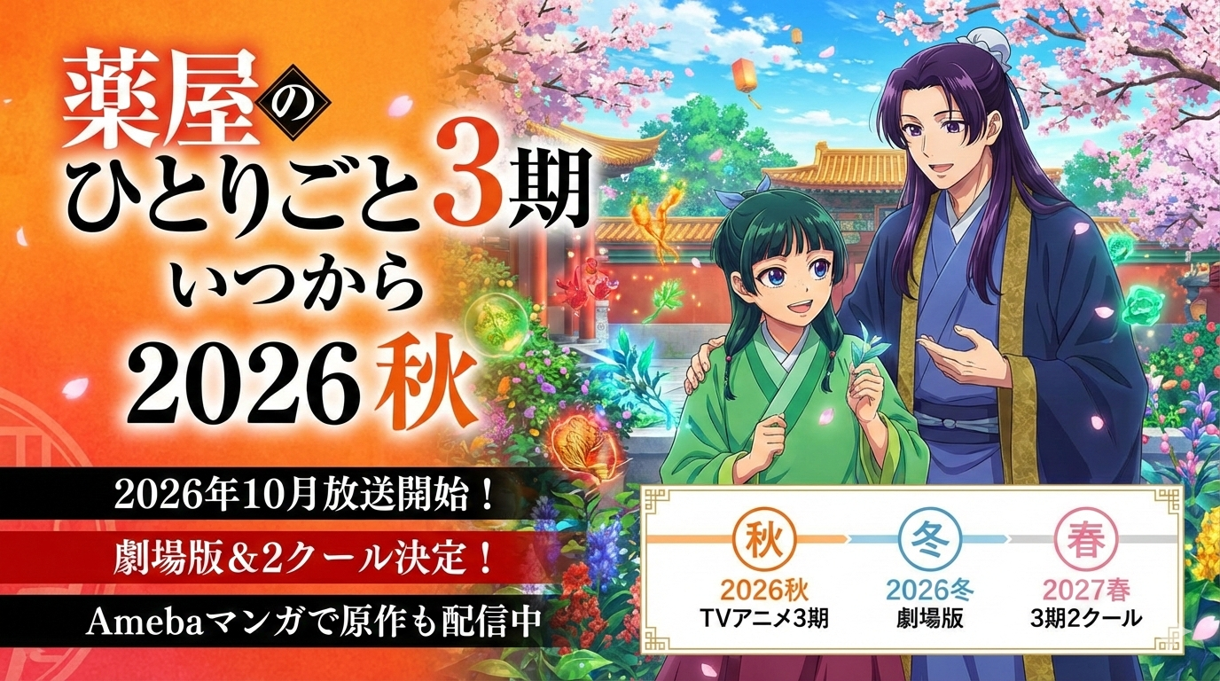 『薬屋のひとりごと』TVアニメ第3期は2026年10月から第1クールが放送開始、2027年4月から第2クールが放送予定です。さらに2026年12月には原作者・日向夏先生による完全新作ストーリーの劇場版も公開決定。この記事では3期の最新情報を網羅しつつ、原作漫画・小説をお得に読む方法まで徹底解説します。