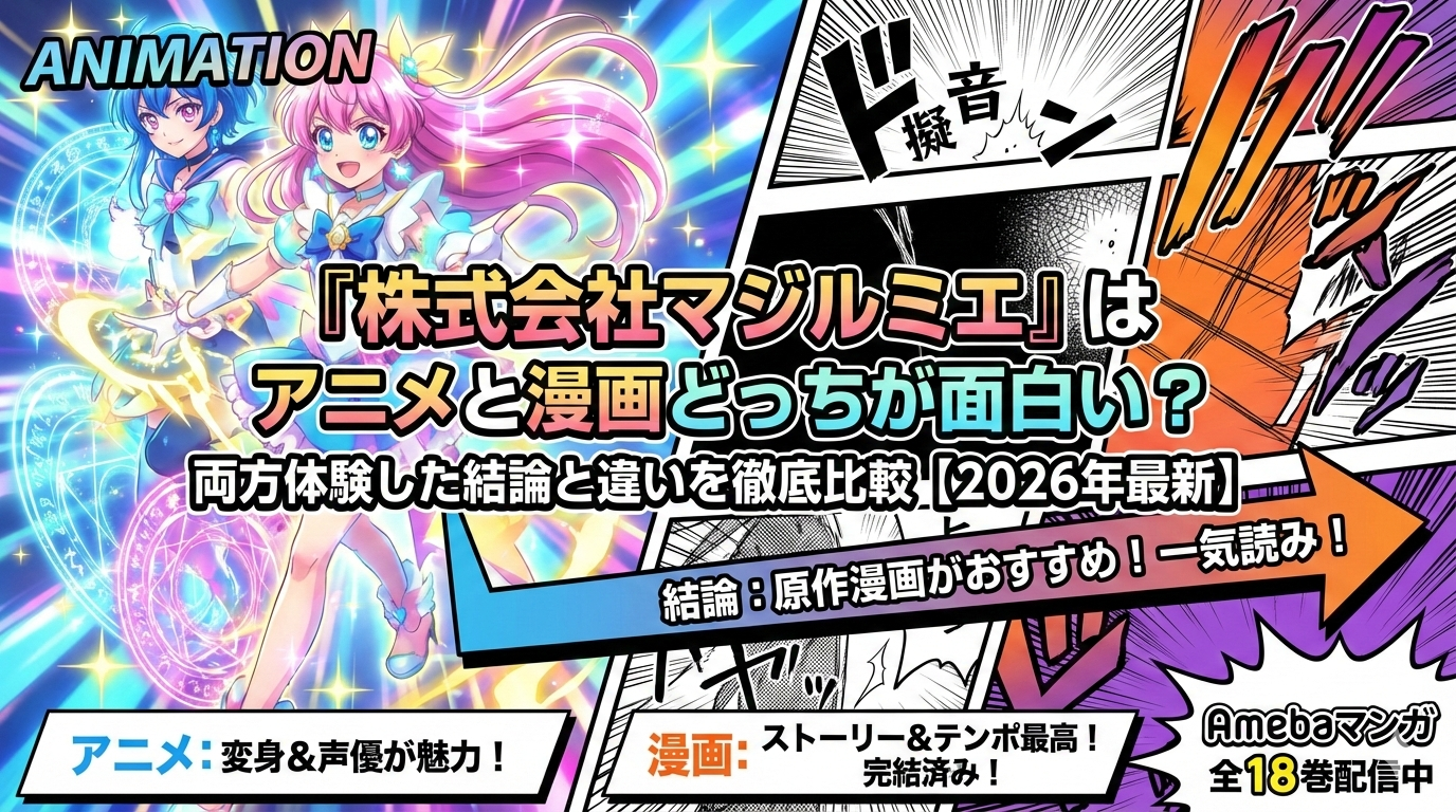 結論から言うと、『株式会社マジルミエ』はアニメ・漫画どちらも面白いですが、ストーリーの深さとテンポの良さを重視するなら原作漫画がおすすめです。アニメは変身シーンや声優の演技が魅力的な一方、テンポ面で原作に及ばないという声が多く、さらに原作漫画は全18巻で完結済みのため、一気読みで最後まで楽しめます。
