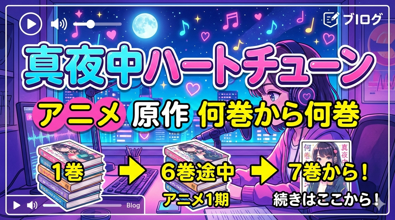 2026年冬アニメとして放送中の『真夜中ハートチューン』(通称マヨチュー)。「アニメは原作漫画の何巻から何巻までの内容?」「続きは何巻から読めばいい?」という疑問を持つ方に向けて、アニメ1期の原作対応範囲、各話ごとの対応表、そしてお得に原作を読む方法まで徹底的にまとめました。結論から言えば、アニメ1期は原作1巻〜6巻途中の内容で、続きを読むなら7巻からがおすすめです。
